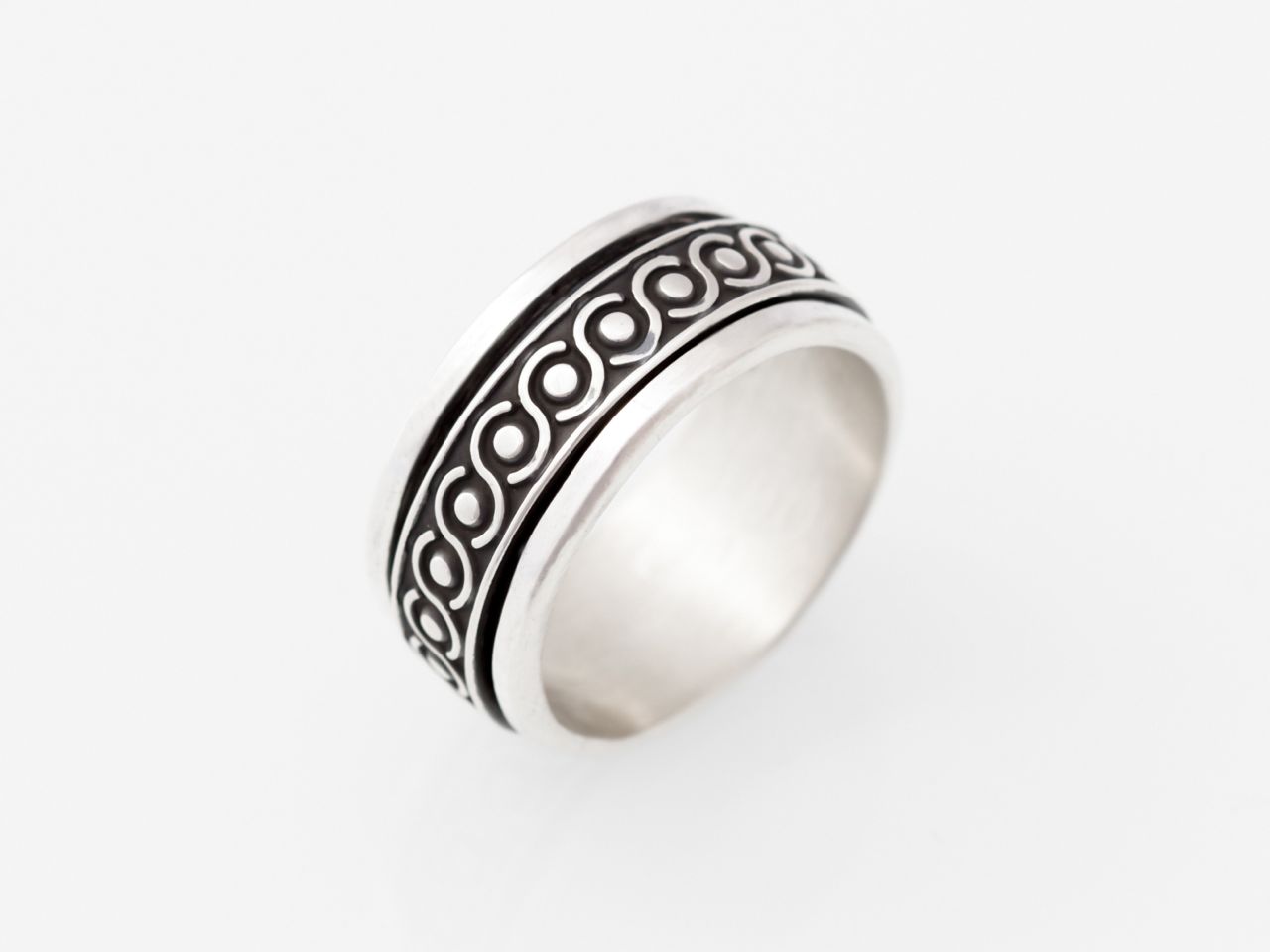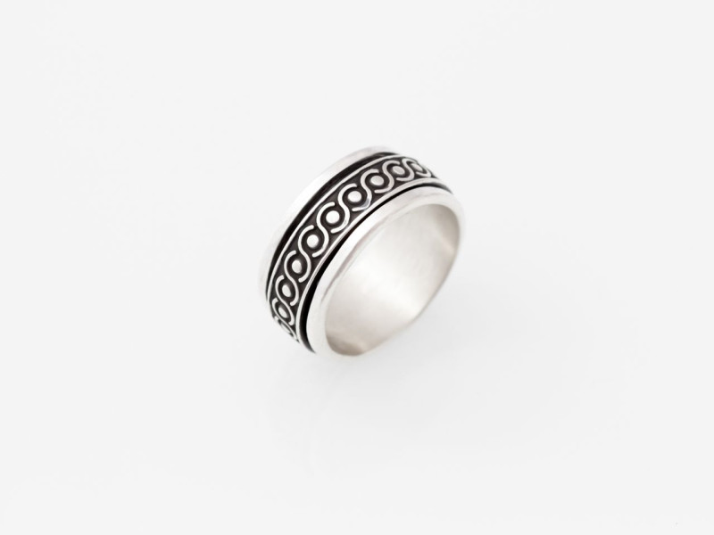This masculine Sterling Silver spinning ring sports a classic Mayan pattern that has been blackened through an oxidising process. The spinning ring has a Mayan inspired symbol. The main band is first made and then the middle is filled down making a groove fitting the spinning ring. This is a playfull ring, spinning around....