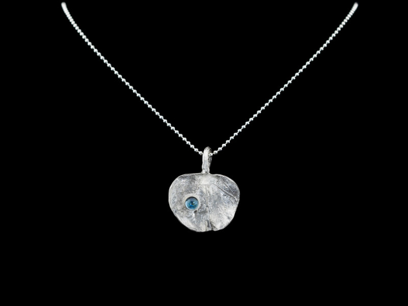 This Sterling Silver necklace features a Lily leaf holding a smooth round London Blue Topaz cabochon.